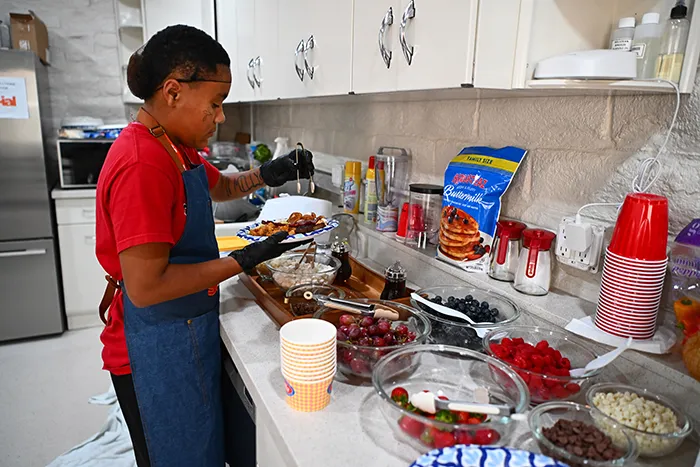His favorite dishes include pasta – he makes his own sauce using a variety of the spices he loves most – and steak, but he’s also learned to make different drinks and teas. He cooks at the Academy, helping to prepare and service a daily lunch.
